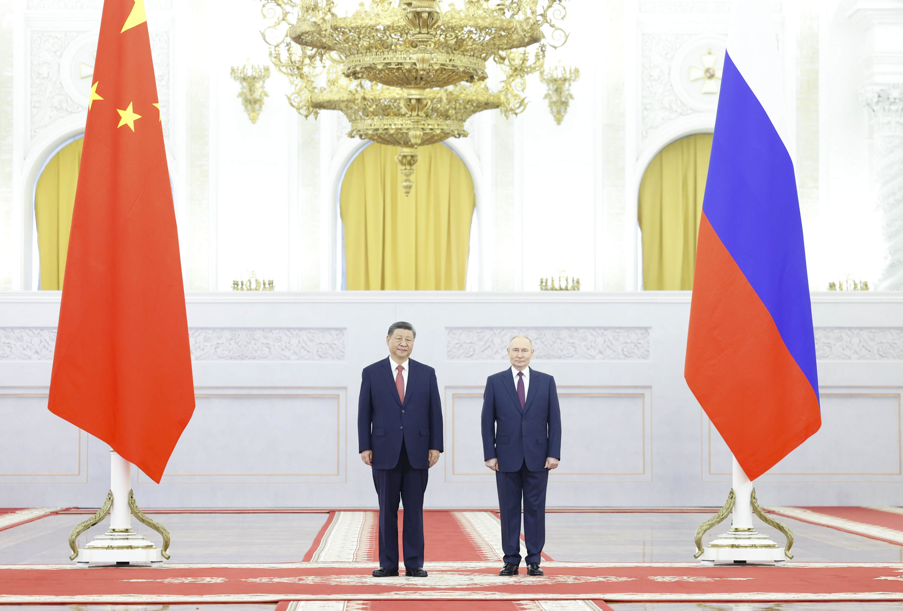 当地时间5月8日上午,俄罗斯总统普京同中国国家主席习近平在莫斯科克里姆林宫举行会谈。这是两国元首举行大范围会谈。新华社记者 姚大伟 摄