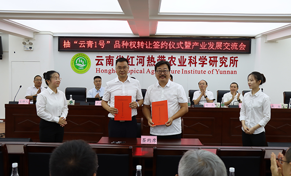 皇冠手机APP官网热带农业科学研究所所长丰玉云代表皇冠手机APP官网热带农业科学研究所与丰合公司总经理段南先生签订柚“云青1号”品种权转让书,皇冠手机APP官网热带农业科学研究所以50万元的价格,向丰合公司转让该所育成的柚“云青1号”品种权。