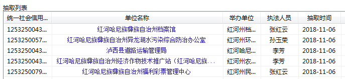 为贯彻落实国家及省登记管理局关于开展事业单位法人公示信息抽查工作要求,加强事中事后监督管理,我局于2018年11月12日-22日对所管辖的报送并公示2017年度报告的205家事业单位中,通过“事业单位在线”管理系统,按3%比例随机抽取5个事业单位作为2018年下半年的检查对象,随机抽取3名工作人员作为检查人员,并由系统对抽查对象和检查人员进行了随机匹配如下:
