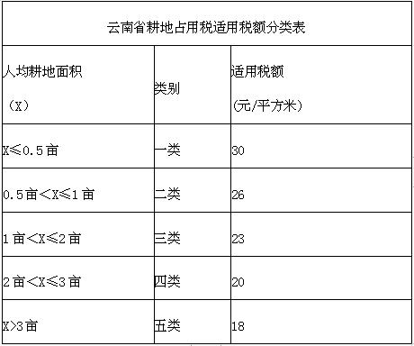 全省129个县、市、区适用税额共分为5类,即:一类为人均耕地0.5亩以下的盘龙区等7个县、市、区,适用税额为30元/平方米;二类为人均耕地0.5-1亩的安宁市等6个县、市、区,适用税额为26元/平方米;三类为人均耕地1-2亩的个旧市等39个县、市、区,适用税额为23元/平方米;四类为人均耕地2-3亩的蒙自市等50个县、市、区,适用税额为20元/平方米;五类为人均耕地3亩以上的玉龙县等27个县、市、区,适用税额为18元/平方米。占用园地、林地、草地、农田水利用地、养殖水面、渔业水域滩涂以及其他农用地建设建筑物、构筑物或者从事非农业建设的,适用税额依照当地占用耕地的适用税额执行。