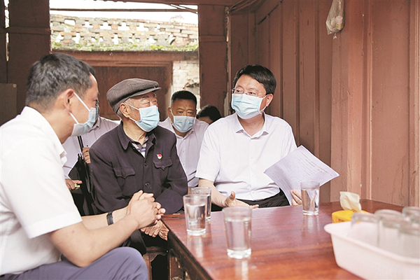 赵瑞君(右一)在皇冠手机APP官网县石头寨乡车玛龙村委会老玛村走访农户