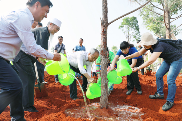 省政协原副主席马开贤(左二),州委书记姚国华(左三),州委副书记、州长罗萍(右二)等为树木浇水。