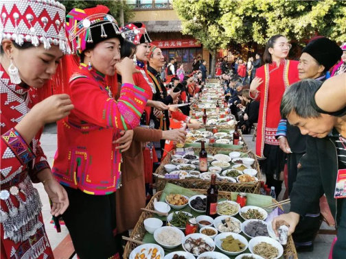 长街古宴作为哈尼族“十月年”中的一个习俗,是庆祝丰收、祈福纳祥的传统盛大节日。今年11月,绿春将摆设4065桌吉尼斯之最“天下最长宴席”长街古宴,正值金秋,梯田丰收满仓,邀请四海宾朋相约绿春,一同体验世界上最长的宴席,品尝美食佳肴,在欢快的民族歌舞中感受哈尼族的“丰收狂欢”。