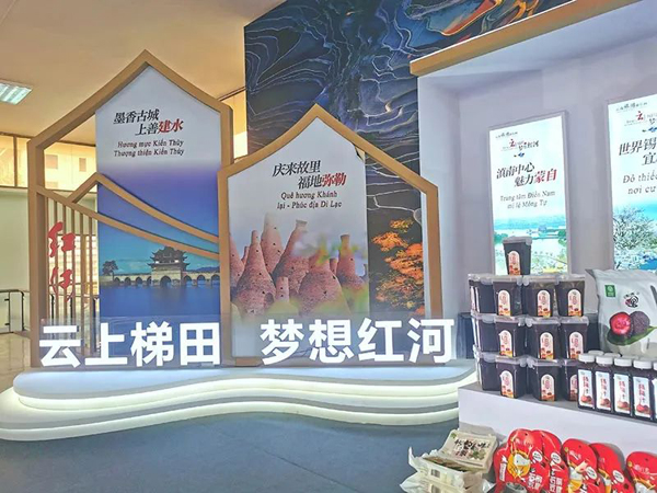 在皇冠手机最新地址手机app文旅展示区,精美的展馆设计瞬间化身打卡点,十三县市的目的地宣传灯箱吸引众多越南游客前来拍照合影。在产品展台区,石屏豆腐、杨梅干、杨梅汁等特产风物,化身“边交会”新宠,游客纷纷前来品尝;而建水紫陶、东风韵文创、石屏花腰彝刺绣、阿者科文创等,让越南朋友们爱不释手。为更好地给大家一个体验空间,元阳古树茶企业将草编桌凳带到现场,给大家置身于古朴的茶环境中,慢享元阳茶香四溢。