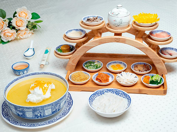 选用猪大腿和土鸡,提前熬制4小时以上得到的高汤,分别将胡椒、鸡油和猪油放入碗中,倒入熬制好的高汤,激发出各种食材的香味,依次放入鹌鹑蛋、脊肉片、鸡肉片、菊花、豆腐皮、豌豆泥、新鲜蔬菜,最后加入顺滑的米线,一口浓香。