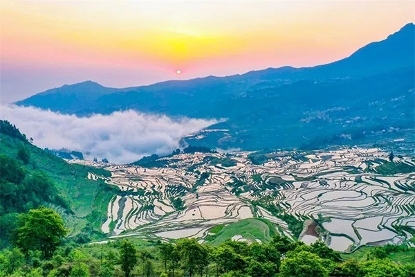 位于元阳县境内的多依树梯田,是观看日出的绝佳地点。哀牢山重峦叠嶂,万亩梯田镶嵌其中。