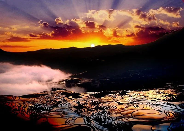 早晨,太阳的光芒喷薄而出,万道霞光将天边的云,地上的梯田都染上颜色。