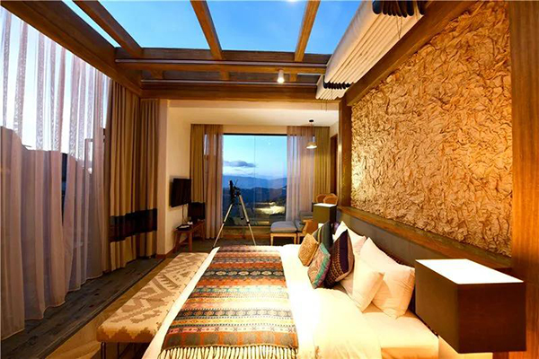 古朴的颜色和质感,让整个民宿与自然融为一体。客房内,大面积的落地玻璃,让每个房间都有醉人的景观视角。其中,拥有三面落地窗的顶层星空房让人尤为沉醉。