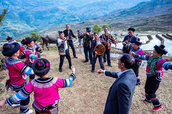 清晨的撒玛坝万亩梯田,云雾缭绕,宛若仙境。村民身着盛装,吹拉弹唱,拍起巴掌,跳起乐作舞,拉开十月年的狂欢序幕。