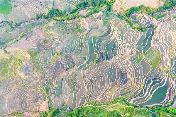 森林、村寨、梯田、水系“四素同构”的自然生态循环系统,闪耀着多民族先人智慧的光芒。山顶森林涵养水源,山腰村寨生产生活,层层梯田净水产粮。以“木刻分水”为代表的水利分配灌溉体系,千百年来、周而复始、循环无尽、生生不息。