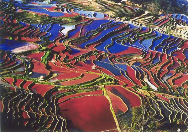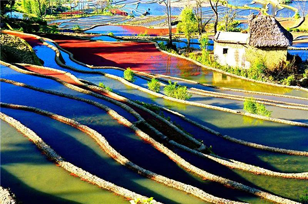 入冬之后,灌满水的梯田,迎来了最佳观赏期,在阳光的映衬下色彩丰富、煜煜生辉。冬日的梯田是安静的,经历了热闹的收割期后,万亩梯田敛尽风华,宛若一位而立之年的哈尼族汉子,沉默安稳,却孕育着来年丰收的希望。站在岸边放眼望去,水田里星星点点的红色浮萍,与夕阳的余晖交相辉映,构成了一幅绝美的暖冬画卷。