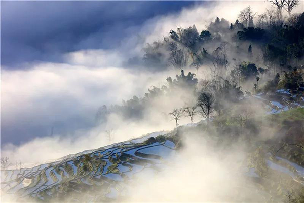 地处世界文化遗产核心区的元阳哈尼梯田景区,17万亩梯田沿着哀牢山缓缓延伸,气势磅礴,美不胜收。冬日里的元阳哈尼梯田,林海、梯田、云雾,还有远处的村庄,袅袅升起的炊烟,构建出一幅人与自然和谐相处的绝美画卷。广袤的梯田中云海翻腾,弥漫、晕染蓝天白云倒映其中,宛若“天堂之境”。波光粼粼、云海茫茫、村落隐约,犹如“泼墨山水”神奇浩瀚。