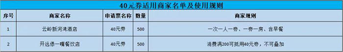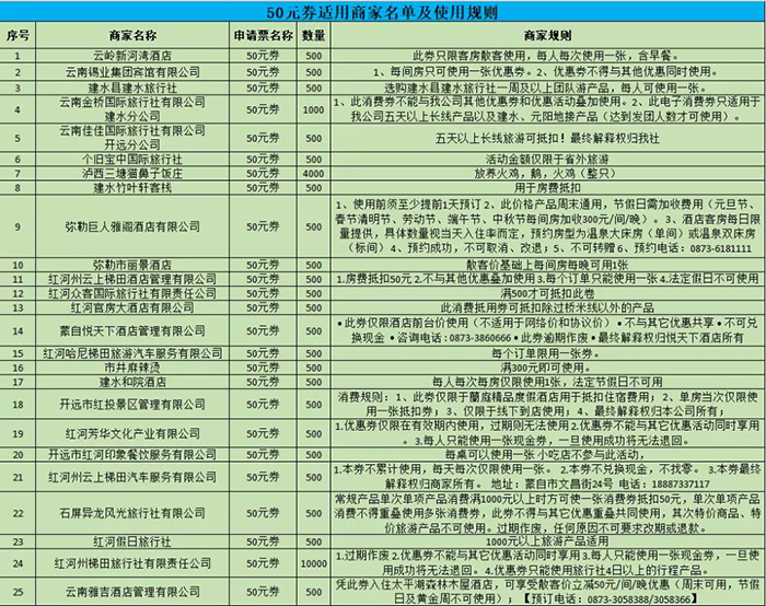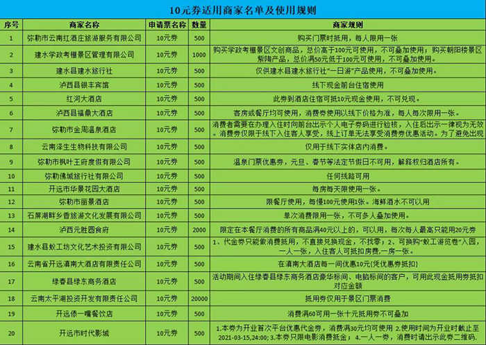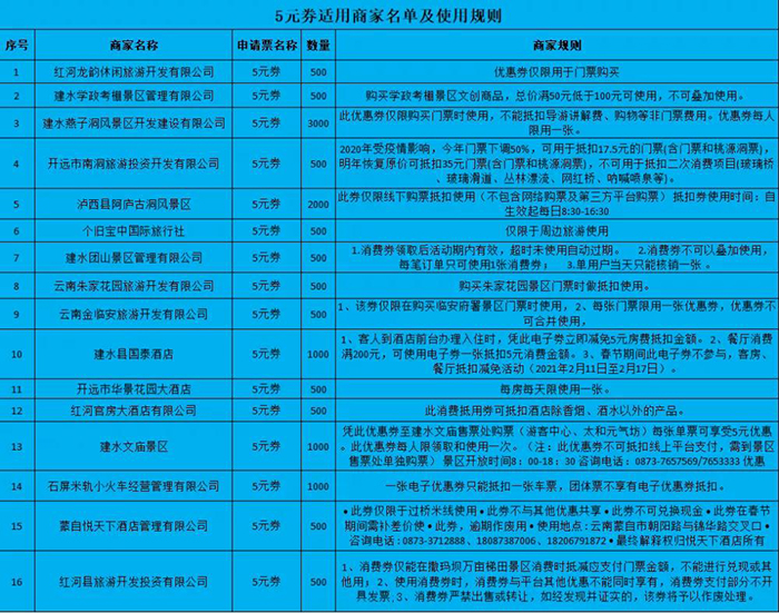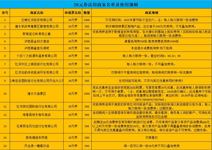 本次活动的参与商家涉及全州文化旅游6大行业7大要素,包括旅游景区提供的门票抵用券、旅游饭店酒店民宿客栈提供的住宿现金抵用券、旅游特色餐厅提供的用餐抵用券、旅游汽车公司提供的租车现金抵用券、旅行社提供的皇冠手机最新地址手机app旅游线路产品现金抵用券,以及包括伴手礼、非遗商品在内的文创商品现金抵用券,包括文化演艺在内的文艺体验项目现金抵用券,消费券(现金抵用券)面额共有5元、10元、20元、30元、40元、50元六个档次。