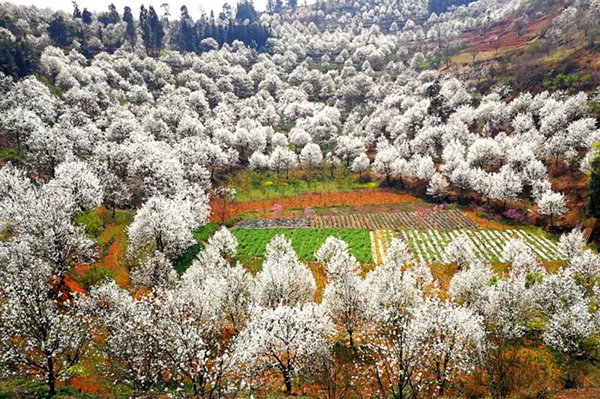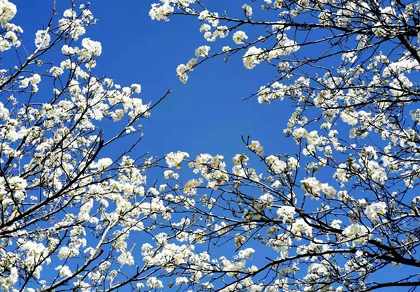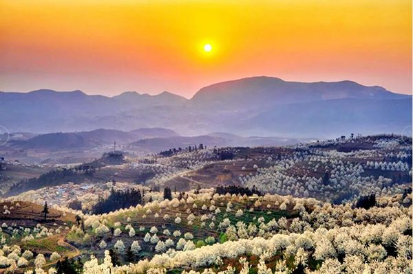 个旧市加级寨有上万亩梨花,至今已有百年历史,每年春季,“梨花谷”一片雪白,成为游客田园梦想之地。