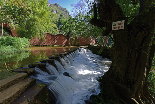 南洞三面环山,一面临坝,山势起伏,雄险壮观,最高海拔1300米;百年历史米轨铁路(滇越铁路)从景区内穿山而过,景区山水树木相交,山石犬牙交错,蕴藏有8个形状不同的溶洞,有的高踞山腰,有的暗藏崖下,参差错落,形成了奇特的具有代表性的地下水溶洞,集地表3000多平方公里日流量稳定的3条地下暗河喷涌而出汇成了南洞河。沿着石板路蜿蜒绕河而行,跨石拱桥,走曲奇的白玉石雕生肖长廊,处处林木掩映,曲折藏幽,亭台楼阁,星罗棋布。山在水中倒影,水在山中静美。诗云:“宇宙谁开此奥区,逶迤万里豆天隅。逆流飞泻龙搏雾,危石含牙虎负隅。未有五丁挥斧凿,自然一窍透虚无。分时造物通灵异,任是迷人也破愚。”大自然的鬼斧神工,造出了南洞雄、险、奇、俊等精妙绝伦的独特景观,闻名遐迩。自然风光和人文景观珠联璧合,美不胜收,彰显洋溢南洞山水之灵性。河边的“犀牛望月”陪伴千年“姻缘树”忠贞坚守日月星辰。山崖一隅塑有一尊大肚笑佛,慈祥宽容,笑天下可笑之人,容天下难容之事。“三皇庙”赫然入目。寺内金塑人类始祖、佛像、神像,堂前梵音袅袅,院间香火飘飘;稍憩,感慨茶盏中叶卷叶舒,惆怅尘世里缘起缘落;俯首顶礼膜拜,祈愿时光不再那么瘦,指缝不再那么宽;释然转世轮回的悲喜,淡泊功名利禄的纠缠。
